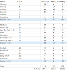 I think meeting duration should play a role some how. So the longer the meeting the worse the meeting. I may add that into our scoring system somewhere. Do you have any other ideas?